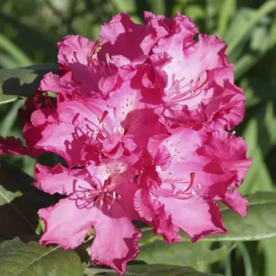 Листья рододендрона 'Хеллики' длиной 8-11 см имеют удлиненно-овальную форму. Они глянцевые с темно-зеленым окрасом, а нижняя сторона листочков покрыта желтовато-серыми ворсинками. Цветы этого сорта, поразительное зрелище в любое время года, образуют крупные щитковидные соцветия диаметром до 20 см. В каждом соцветии распускается от 8 до 12 летних бутонов, которые имеют притягательный пурпурно-красный цвет с красно-оранжевыми крапинками на верхнем лепестке и светло-розовыми тычинками. Цветение начинается в июне и продолжается около трех недель, радуя глаз своими яркими оттенками.
