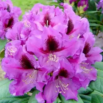 Цветы рододендрона Распутин имеют шаровидную форму соцветия и компактный размер. Окраска цветов насыщенно-фиолетовая, с темным пятном на верхнем лепестке. Их размер составляет до 6 сантиметров, а количество лепестков – 5. Цветы имеют легкий аромат.