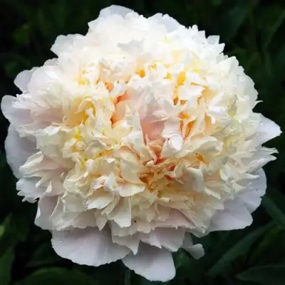 Цветы пиона Чеддер Чиз отличаются махровой и розовидной структурой. Диаметр цветка составляет 16-18 см. Кремовые лепестки украшены лимонно-желтыми петалодиями внутри. Насыщенность цвета светлая, а форма лепестков округлая с волнистым краем. Каждый цветок обладает приятным, легким ароматом, что добавляет дополнительный шарм этому виду.