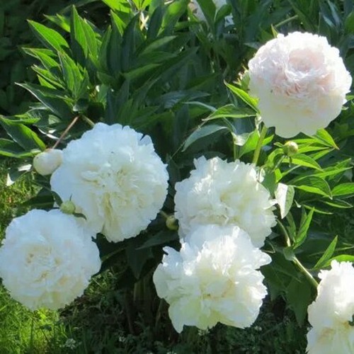 Цветы этого вида пиона отличаются махровым строением и крупными размерами: диаметр каждого цветка может достигать 25 см. Их сливочно-белый цвет с едва заметным розовым напылением излучает элегантность и изысканность. Аромат цветков пряный и насыщенный, что делает их прекрасными для срезки и создания флористических композиций.