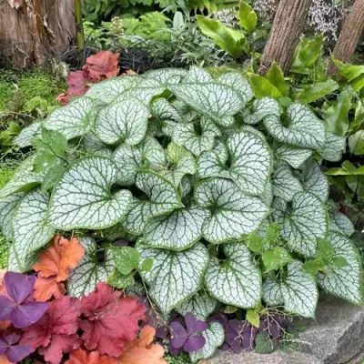 Куст формируется плотный, аккуратный. Средняя высота — 35–40 см, ширина — до 60 см. Листья крупные, сердцевидные, с матовой поверхностью, которая подчёркивает фактуру. Каждый лист уникален по рисунку. В условиях полутени Джек Фрост особенно ярок — контраст между светлой листвой и приглушённым фоном работает на глубину и баланс посадки.