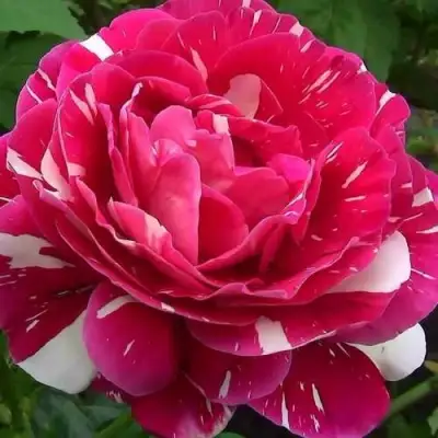 Цветки этой розы являются настоящим произведением искусства. Их окраска полосатая, малиновая со светлыми полосами. Малиновая окраска является основной. Цветок удивляет своей чашевидной формой и размером - он крупный, диаметром от 10 до 12 см. Цветки расположены как одиночно, так и в соцветиях. На стебле может быть от одного до трех цветков.