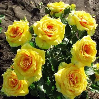 Цветки розы Сан Сити имеют яркую окраску сначала ярко-желтого цвета, а затем переходят в более светлые тоновые оттенки. Основной цвет цветка - желтый, насыщенный и яркий. Кайма цветка имеет насыщенно-красный оттенок, что придает ему особую привлекательность. Форма цветка чашевидная, диаметром 4-6 см. Цветок махровый и состоит из 25 лепестков. На каждом стебле обычно располагается от 5 до 10 цветков, что делает эту розу очень ценной для срезки.