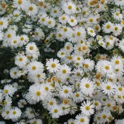 Цветение стартует в августе и продолжается до октября. Цветки мелкие (до 2,5 см), но за счёт количества создают эффект плотного соцветия. Белоснежные лепестки и жёлтая серединка напоминают мини-астры или ромашки. Оттенок цветов чистый, что особенно ценно в монохромных и контрастных посадках. Аромат отсутствует, что делает растение идеальным для участков рядом с террасами и зонами отдыха.