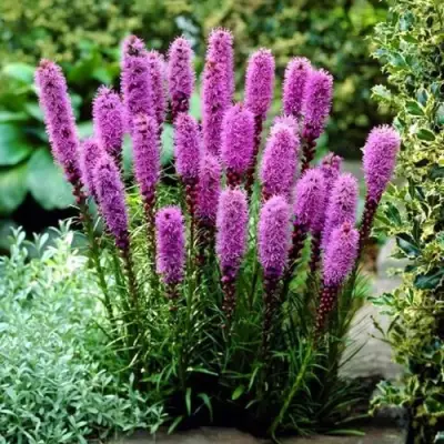 Розеа формирует стройный, компактный куст высотой 50–60 см и шириной до 30 см. Стебли прямые, прочные, не требуют подвязки. Крона плотная, но не громоздкая — лиатрис не разрастается вширь, а сохраняет вертикаль, что делает его идеальным для переднего и среднего плана миксбордеров. Растёт на одном месте без потери декоративности 4–5 лет.